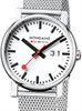 Mondaine "Evo", model A669.30305.11SBM. Big Date with Swiss quartz movement. Highly polished stainless steel case and slightly domed mineral glass crystal. White dial with raised black markers. Includes a 16mm steel mesh band.