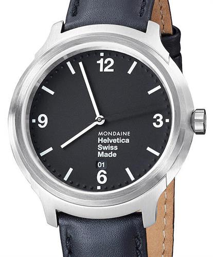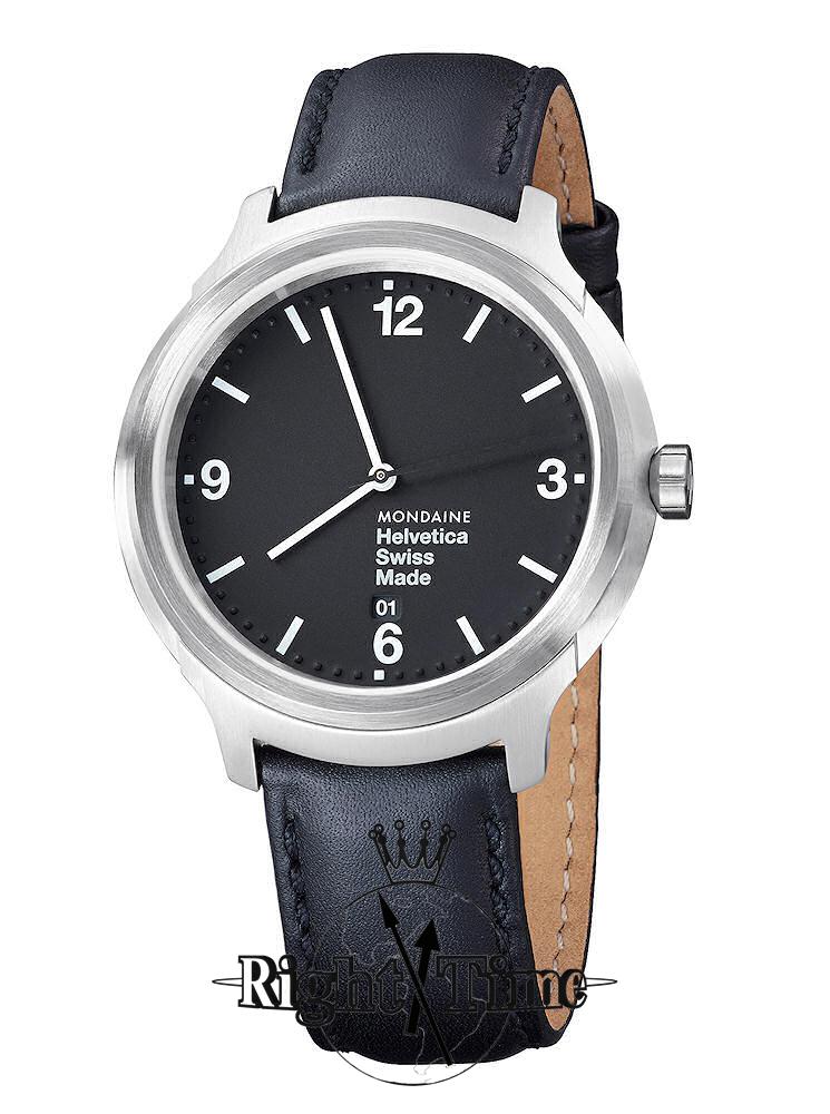 Mondaine Helvetica No1 Bold watch model MH1.B1220.LB powered by quartz RONDA movement. Stainless steel case with black color leather strap and sapphire crystal over black dial.