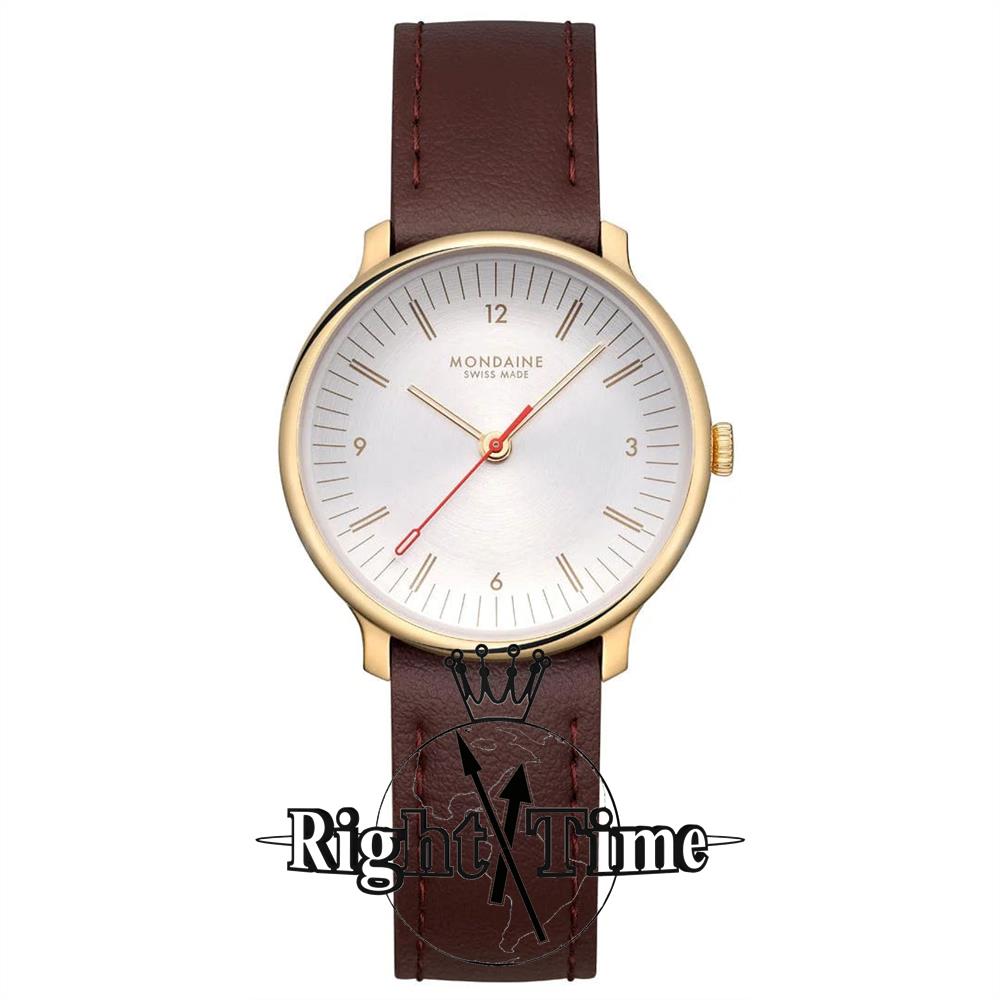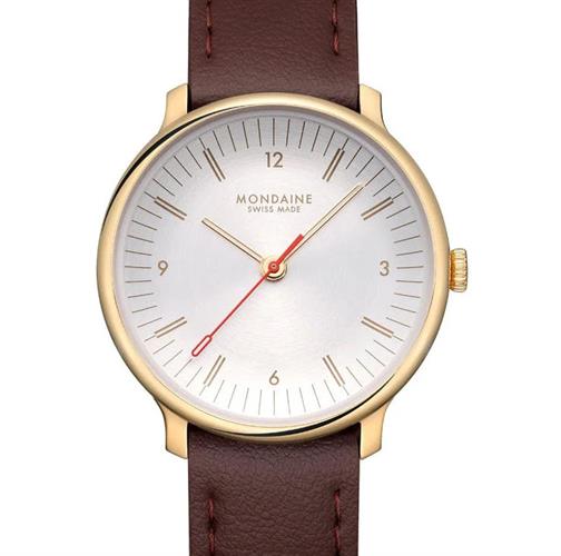 33mm Mondaine wrist watch model MLE.33110.LGV. Polished gold plated stainless steel case with brown leather strap. White dial. Powered by quartz movement