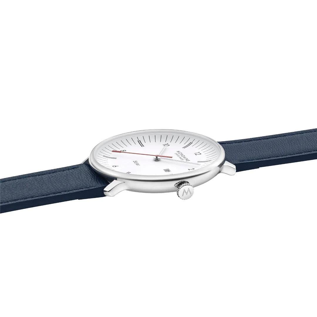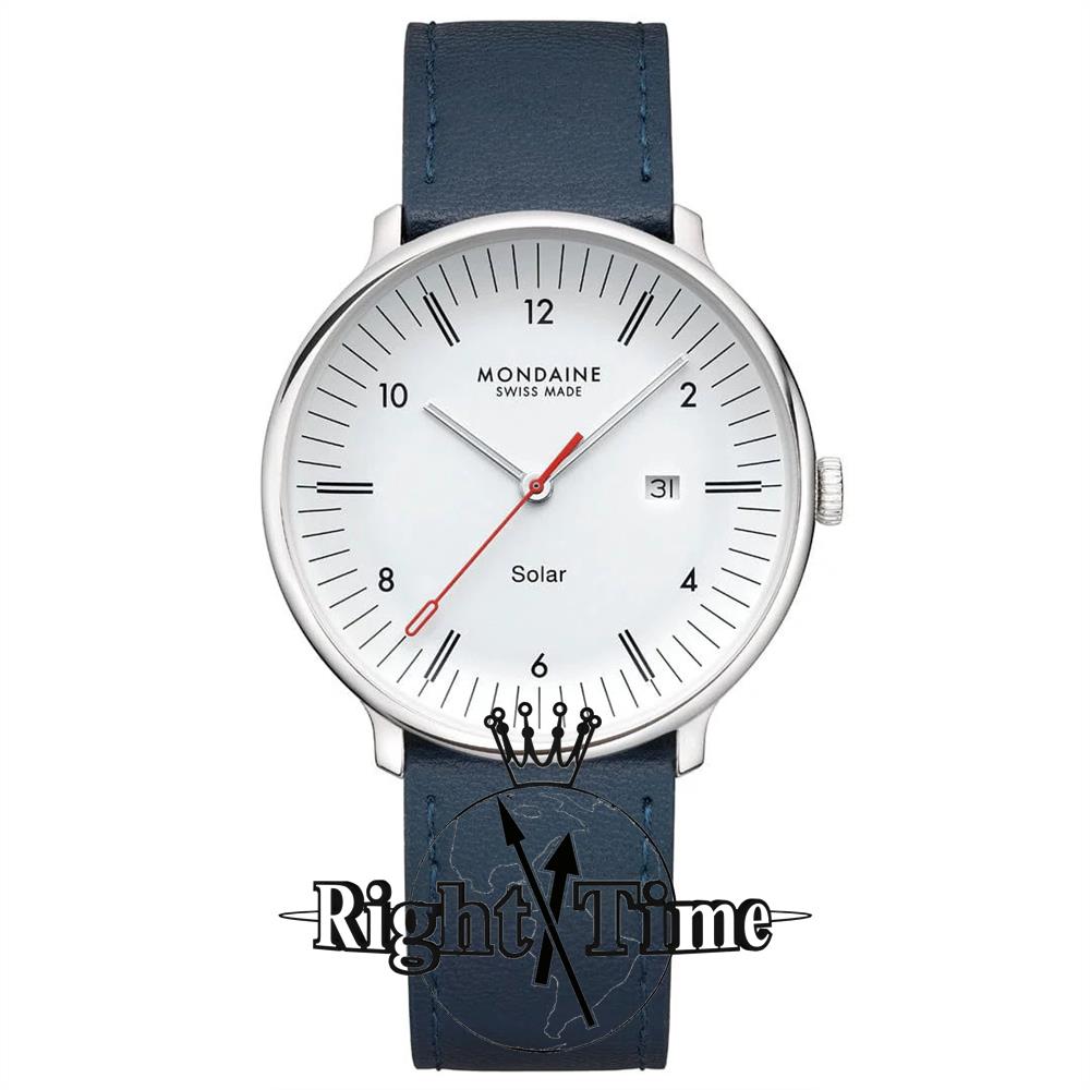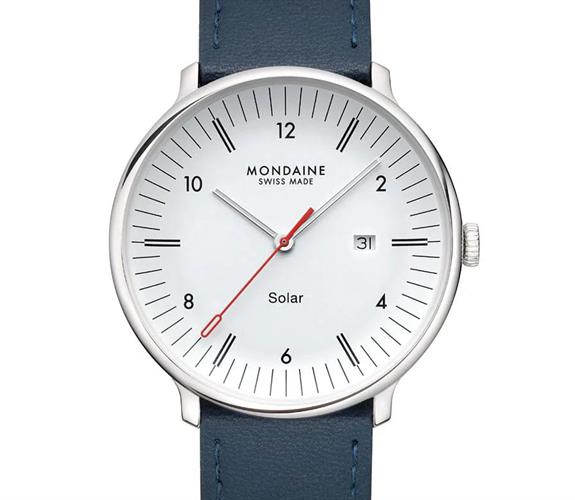 41mm Mondaine wrist watch model MLE.41910.LDV. Polished stainless steel case with blue leather strap. White dial with date. Powered by solar quartz movement