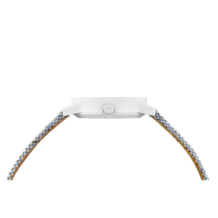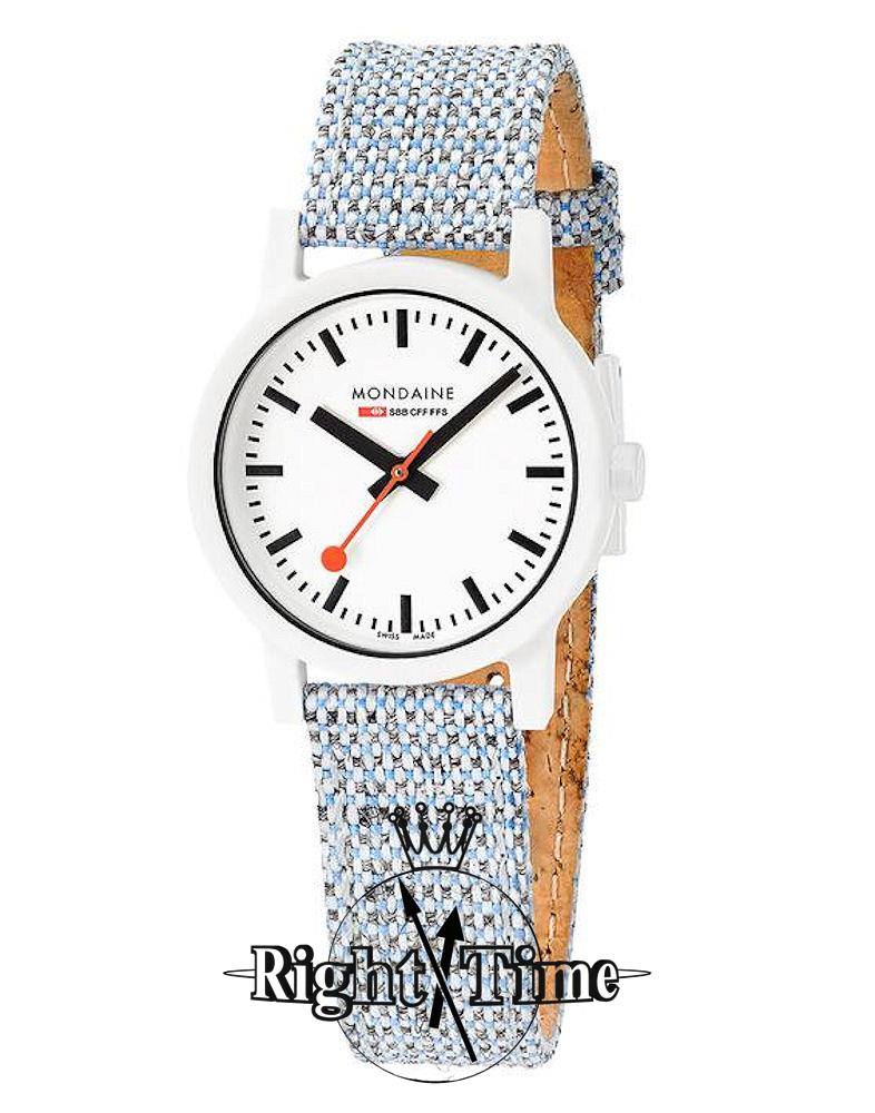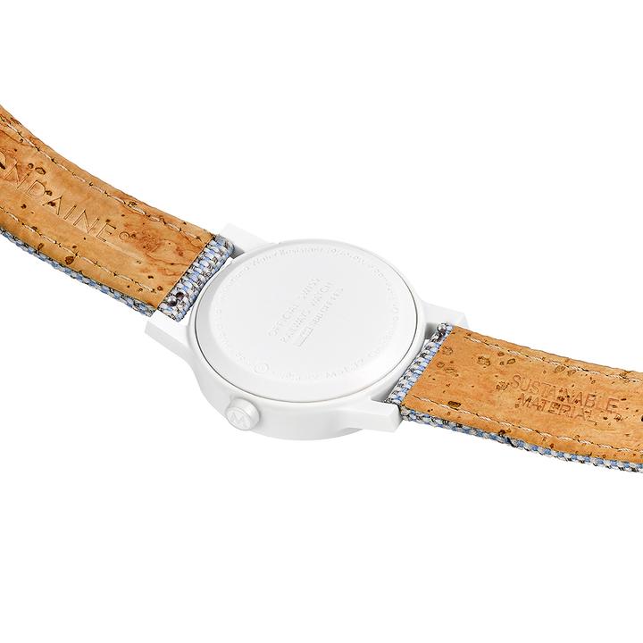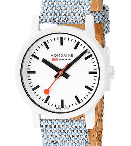 Ladies 32mm Mondaine wrist watch model MS1.32110.LD in a case made of white renewable raw material. White dial with black markers. Comes with a powdered blue textile strap with cork lining.