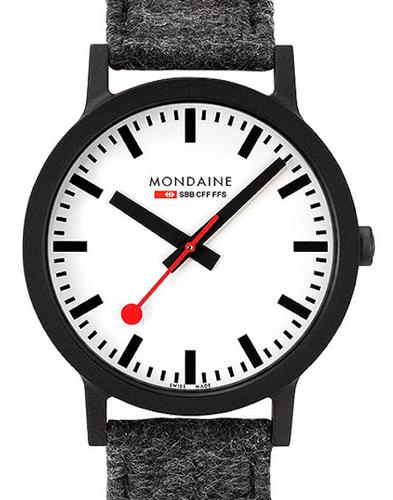 Ladies 41mm Mondaine wrist watch model MS1.41110.LH in a case made of black renewable raw material. White dial with black markers. Comes with a grey textile strap with cork lining.
