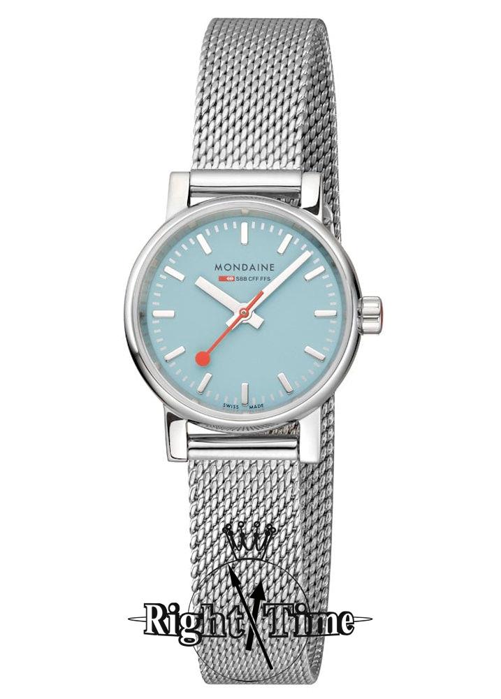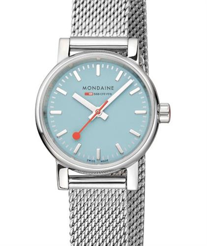 Mondaine EVO2 wrist watch model MSE.26140.SM. Polished stainless steel 26mm case. "Turquoise Lake" dial with classic white markers. Comes on steel mesh bracelet