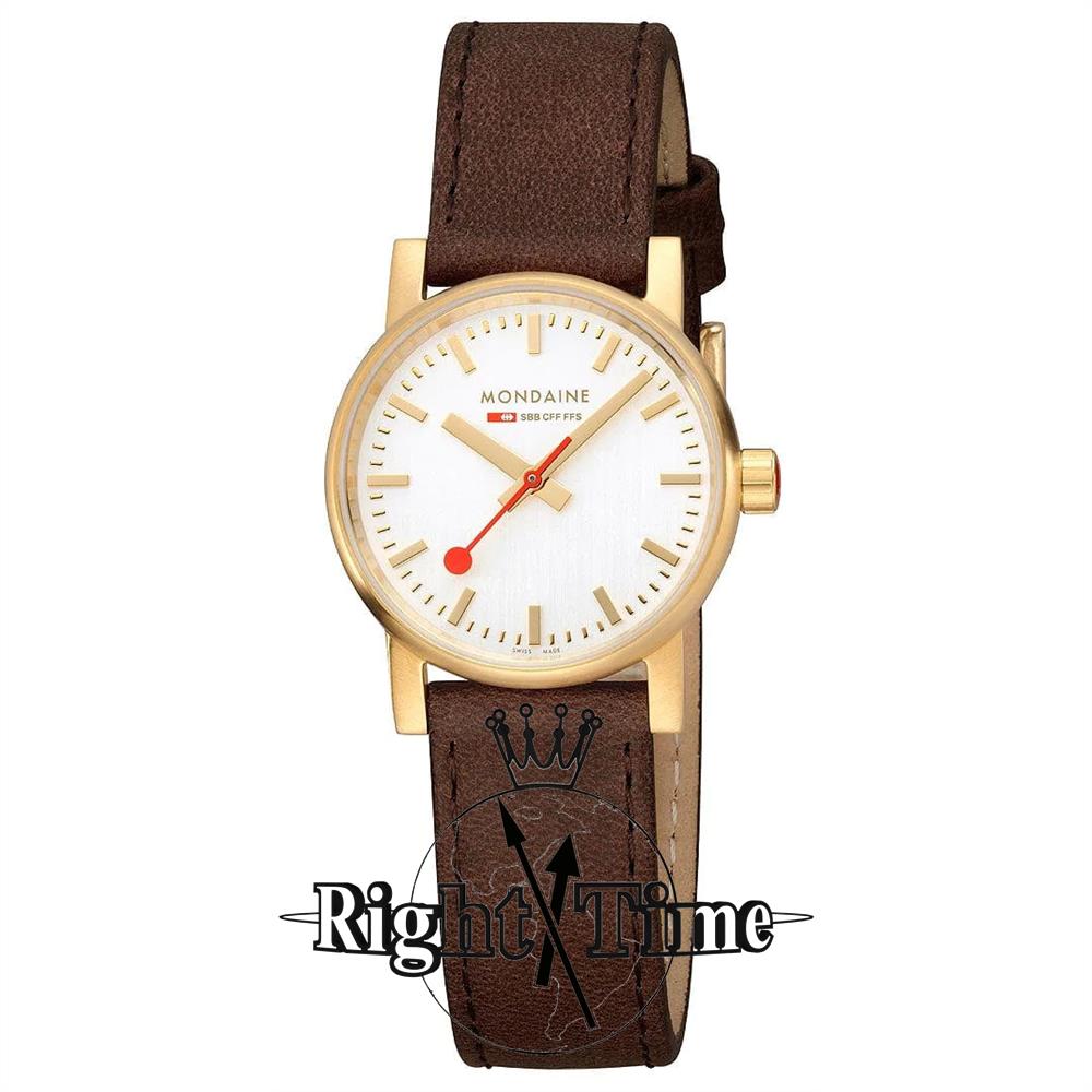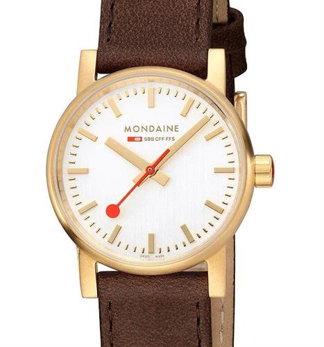 Ladies 30mm Mondaine wrist "EVO 2" model MSE.30112.LG in gold tone stainless steel case. White dial with raised golden markers. Comes with a brown leather watch band.
