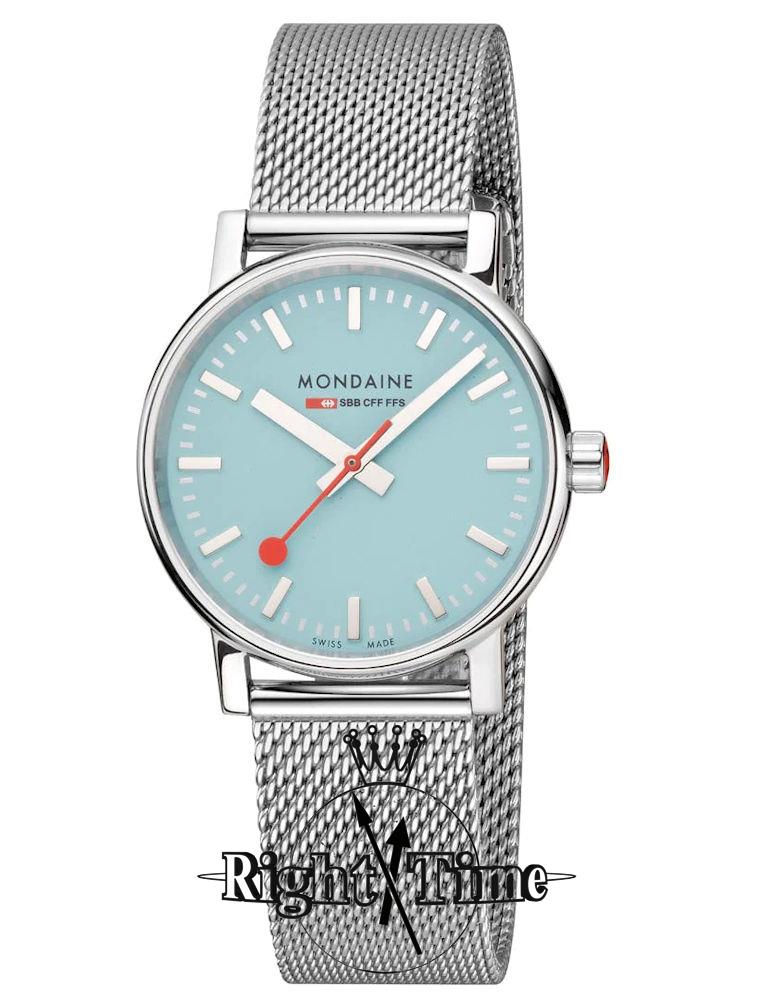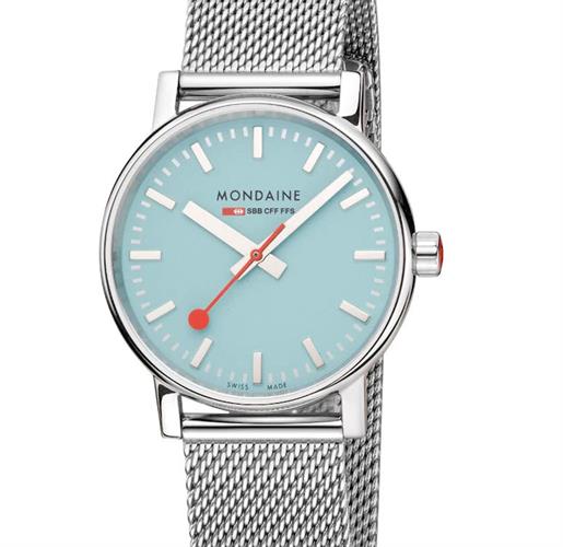 Mondaine EVO2 wrist watch model MSE.35140.SM. Polished stainless steel 35mm case. "Turquoise Lake" dial with classic white markers. Comes on steel mesh bracelet