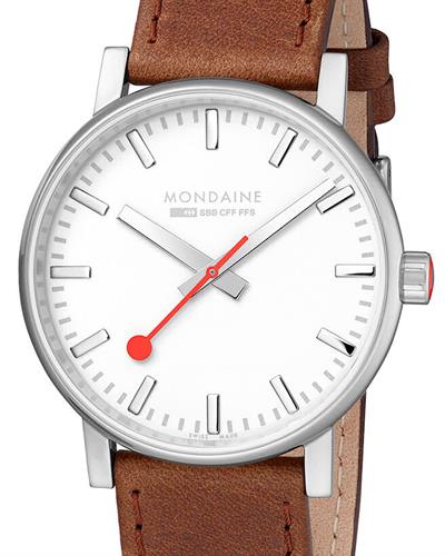 Ladies 40mm Mondaine wrist "EVO 2" model MSE.40110.LG in polished stainless steel case. White dial with raised steel markers. Comes with a brown leather watch band.