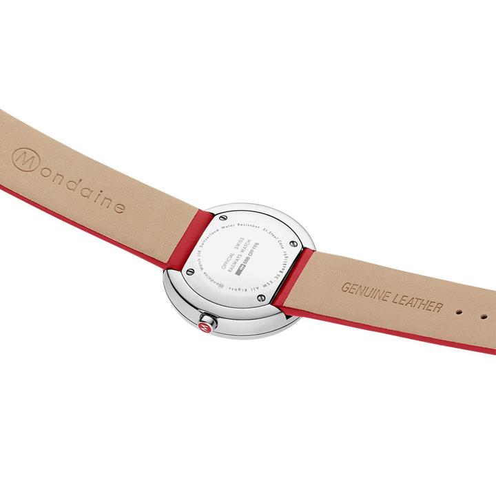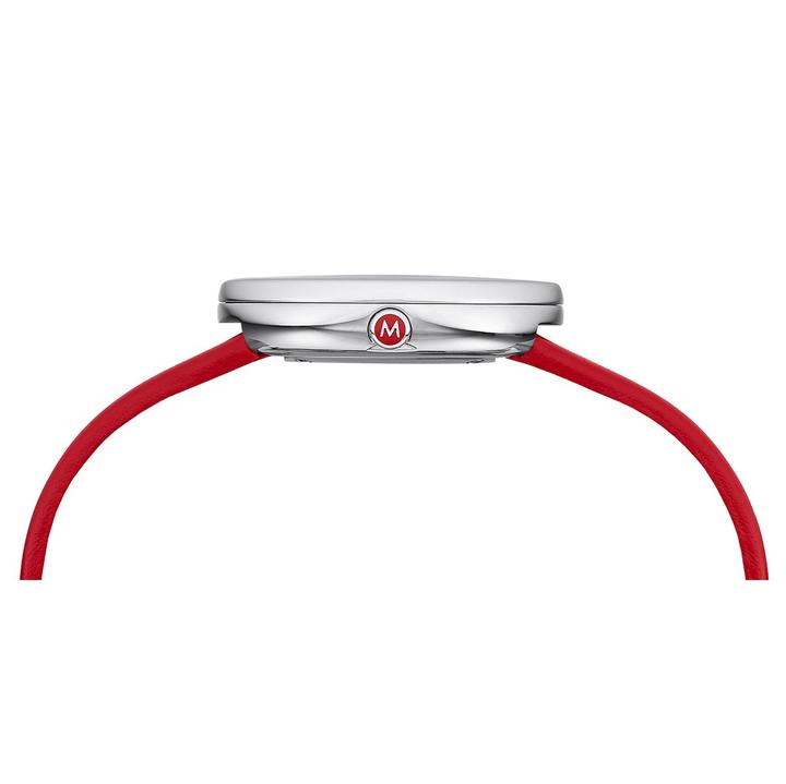 Mondaine Mini Giant BackLight wrist watch model MSX.3511B.LC. Polished stainless steel case. White dial with classic black markers and innovative BackLight technology. Comes with a red leather strap