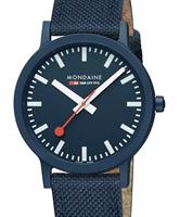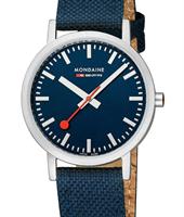 Mondaine wrist watch model A660.30314.40SBD from Mondaine Classic Collection. Swiss quartz movement, brushed stainless steel case, blue textile watch band from recycled PET Bottles with cork lining. Official Swiss Railway Watch Design, blue dial with white hands and indexes.