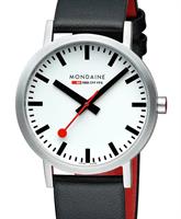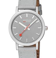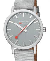 40mm Mondaine wrist "Classic" model A660.30360.80SBH in satin finish stainless steel case. Grey dial with white markers. Comes with a grey textile watch band from recycled PET Bottles with cork lining.