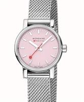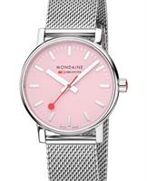 Mondaine EVO2 wrist watch model MSE.35130.SM. Polished stainless steel 35mm case. Pink dial with classic white markers. Comes on steel mesh bracelet