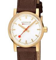 33mm Mondaine wrist watch model MLE.33110.LGV. Polished gold plated stainless steel case with brown leather strap. White dial. Powered by quartz movement