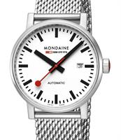 40mm Mondaine wrist "EVO 2" model MSE.40210.SM. Powered by quartz movement. Stainless steel case. White dial with black markers. Comes on a bracelet