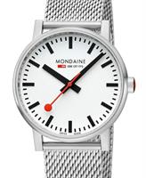 40mm Mondaine wrist "Classic" model A660.30360.40SBJ in satin finish stainless steel case with mesh bracelet. Blue dial with white markers.