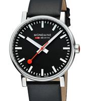 Ladies 43mm Mondaine wrist "EVO 2" model MSE.43120.LB. Powered by quartz movement. Stainless steel case. Black dial with white markers. Comes on a black leather strap