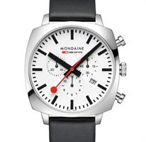 Ladies Cushion 41mm Mondaine chronograph watch model MSL.41410.LBV.SET in a polished stainless-steel case with rounded corners. White dial with black markers. Comes with a black leather strap and steel mesh band