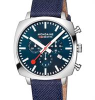 Grand Cushion 41mm Mondaine wrist watch model MSL.41440.LD.SET in a polished stainless-steel case with rounded corners. Blue dial with white markers. Comes in a set with blue textile strap from recycled PET bottles and Milanese mesh stainless steel bracelet