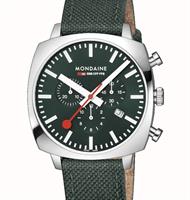 Grand Cushion 41mm Mondaine wrist watch model MSL.41460.LF.SET in a polished stainless-steel case with rounded corners. Green dial with white markers. Comes in a set with green textile strap from recycled PET bottles and Milanese mesh stainless steel bracelet