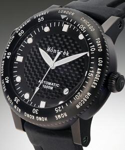 Montrek World Timer Watch model M32-1232-L321 powered by Miyota 8215 Automatic movement with date calendar. Black PVD plated stainless steel case. Bi-directional turning bezel with Cities of the World. Black carbon fiber dial with luminous markers and hands. Black rubber strap. Water resistant to 1000 meters