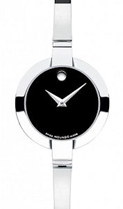 Movado Bela watch for ladies model 0605853. Swiss quartz movement. Stainless steel case, bangle bracelet. Black Movado Museum dial.