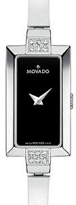 Movado Bela watch for ladies model 0606133. Swiss quartz movement. Stainless steel rectangular case with diamonds, bangle bracelet. Black dial.