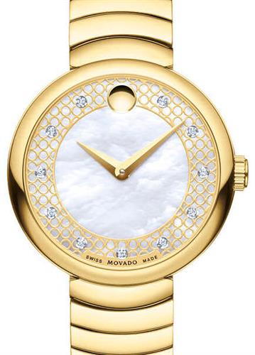 Movado Myla watch for ladies model 0607045. Swiss quartz movement. Stainless steel gold plated case with curved link bracelet. Mother-of-Pearl dial with lacy pierced overlay ring set, Movado Museum dial, and 11 diamond markers (0.043 t.c.w.)