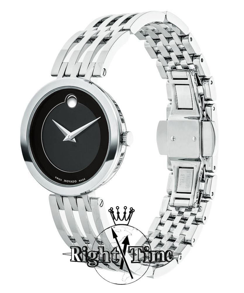 Movado Esperanza watch for ladies model 0607051. Swiss quartz movement. Stainless steel case with bracelet. Black dial with raised lacquer-finish outer ring and Movado Museum dot