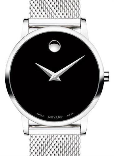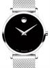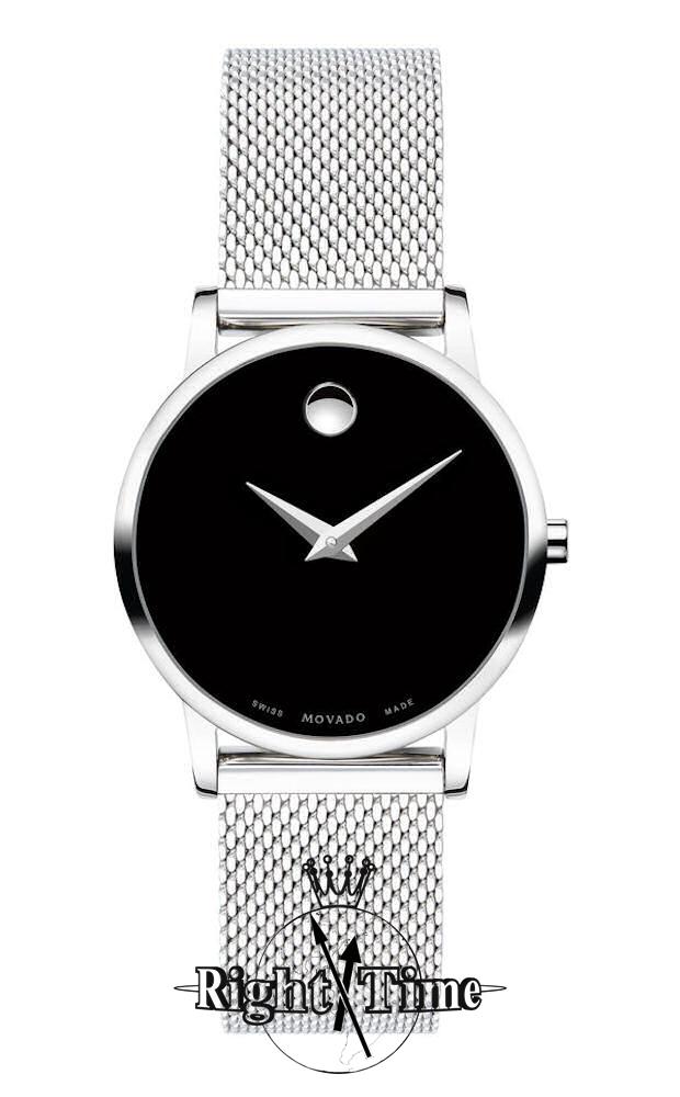 Movado Ultra watch for ladies model 0607220. Swiss quartz movement. Stainless steel case and bracelet. Black dial with silver hands and Movado Museum dot.