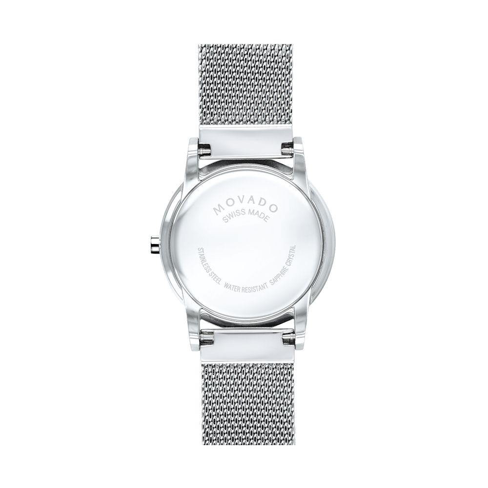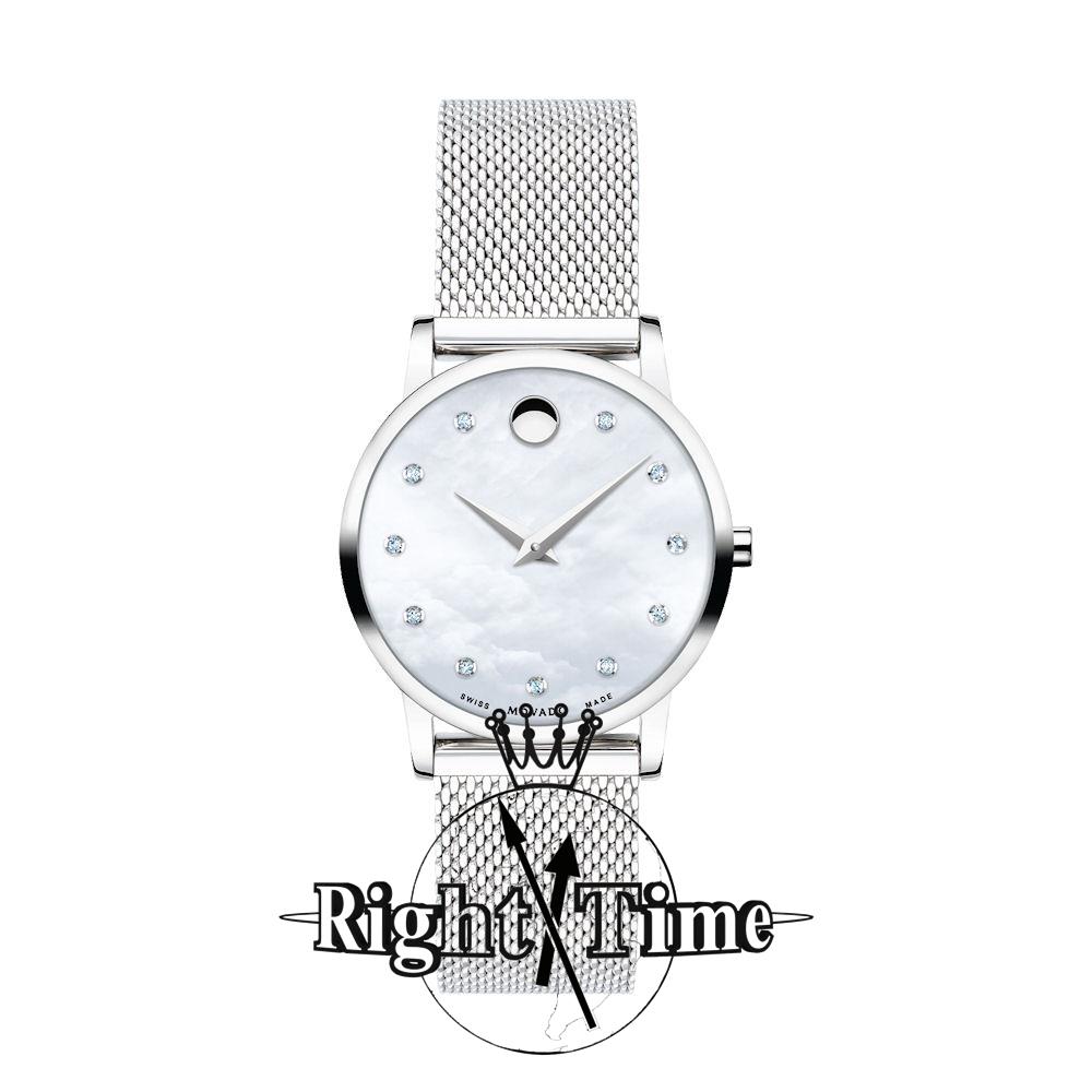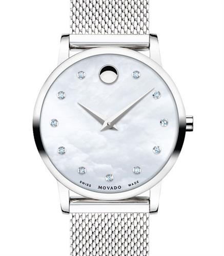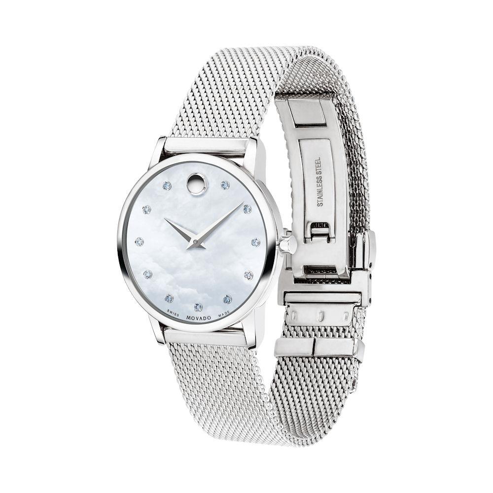 Movado Museum Classic watch for ladies model 0607491. Swiss quartz movement. Stainless steel case with mesh bracelet. White Mother-of-Pearl dial with Movado Museum dot and diamond markers.
