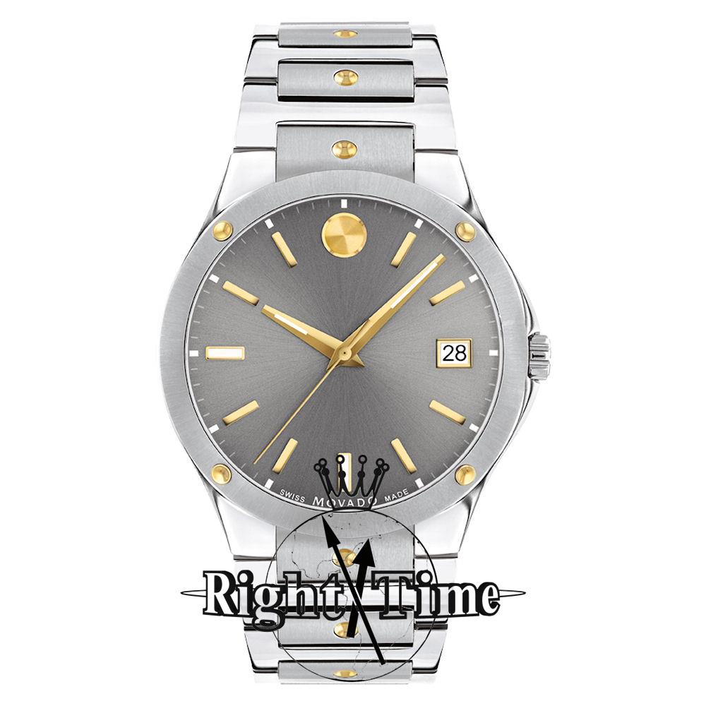 Movado SE watch model 0607514. Swiss quartz movement. Stainless steel case and bracelet with yellow gold tone PVD plated accents. Grey dial with Movado Museum dot. Sapphire crystal.