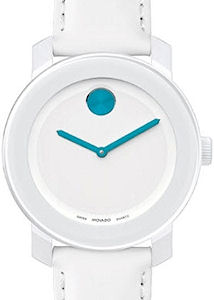 Visit our stores to see all Movado Bold watches. Movado BOLD watch in 36mm white TR90 composite material/stainless steel case with white dial, teal hands, white leather strap