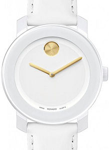 Visit our stores to see all Movado Bold watches. Movado BOLD watch in 36mm white TR90 composite material/stainless steel case with white dial, gold metallic Movado Museum dot, gold-tone hands, white leather strap