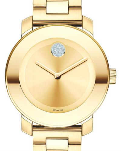 Movado BOLD watch in 36mm gold ion plated stainless steel case and bracelet. Gold tone dial, crystal Movado Museum dot, gilt hands.