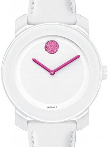 Visit our stores to see all Movado Bold watches. Movado BOLD watch in 36mm white TR90 composite material/stainless steel case with white dial, pink hands, pink Movado Museum dot made with Swarovski elements, white leather strap