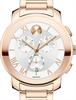 Movado BOLD watch in 40mm stainless steel rose gold plated case with bracelet. Quartz chronograph movement with day/date. Silver color dial with large gold tone Roman numerals.