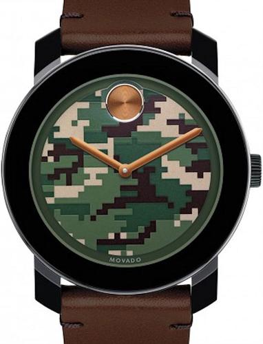 Movado BOLD watch in brown TR90 composite material/stainless steel 42mm case with quartz movement. Green, brown and beige camouflage-print dial with Movado Museum dot. Brown Colorado leather strap.