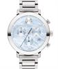 Movado BOLD watch in stainless steel 38mm case with quartz chronograph movement. Ice blue Mother-of-Pearl dial with Movado Museum dot. Bracelet