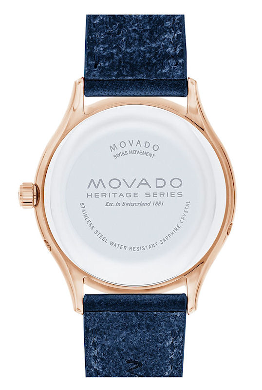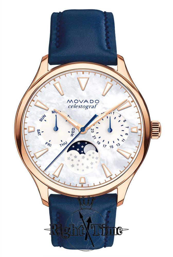Movado Series Celestograf watch for ladies model 3650011. Swiss quartz movement. Stainless steel gold plated case, white Mother-of-Pearl dial with day/date and moon-phase sub-dials. Navy blue leather band.