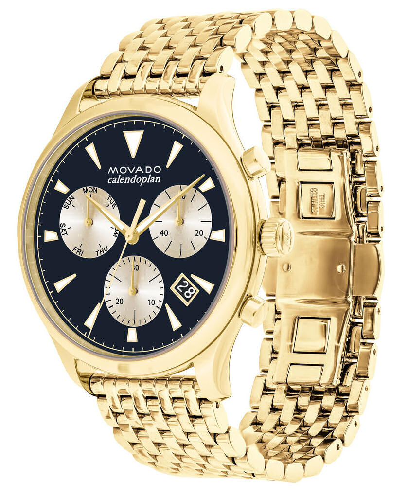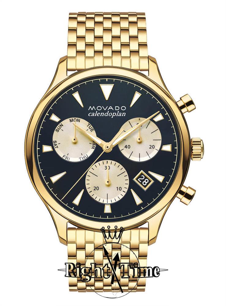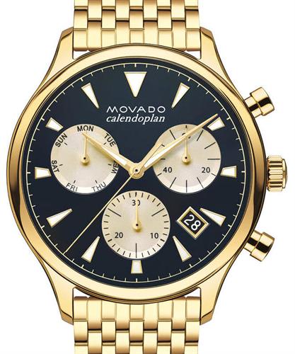 Movado Heritage Series Calendoplan watch model 3650015. Swiss quartz chronograph movement with day/date calendars. Stainless steel yellow gold plated case. Black color dial with gilt sub-dials, luminous hands and markers. Gold plated steel bracelet
