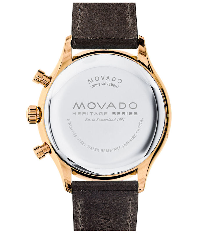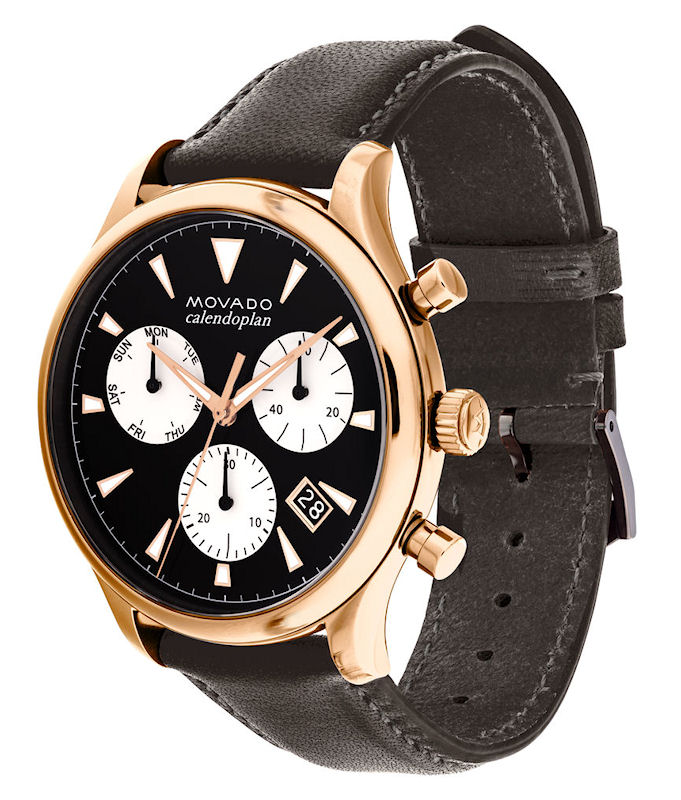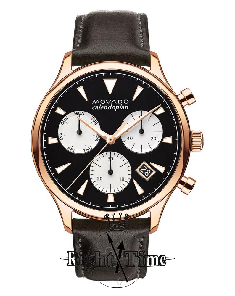 Movado Heritage Series Calendoplan watch model 3650021. Swiss quartz chronograph movement with day/date calendars. Stainless steel rose gold plated case. Black color dial with white sub-dials, luminous hands and markers. Brown leather strap