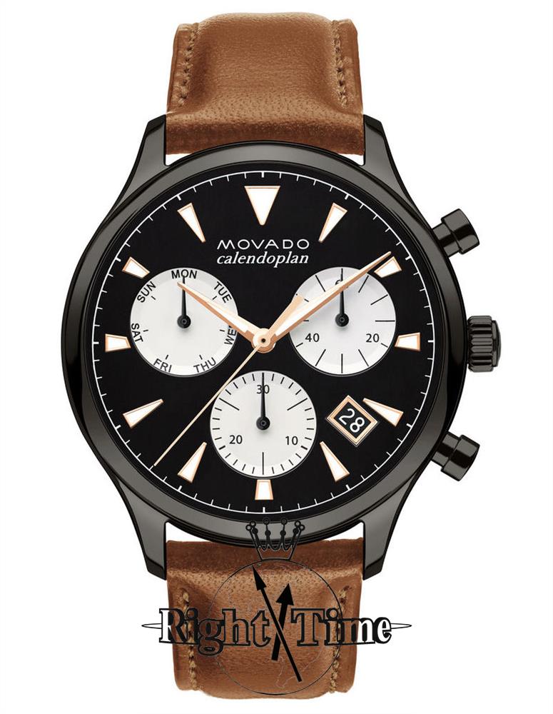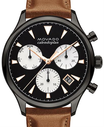 Movado Heritage Series Calendoplan watch model 3650022. Swiss quartz chronograph movement with day/date calendars. Stainless steel grey plated case. Black color dial with white sub-dials, luminous hands and markers. Brown leather strap