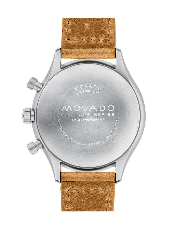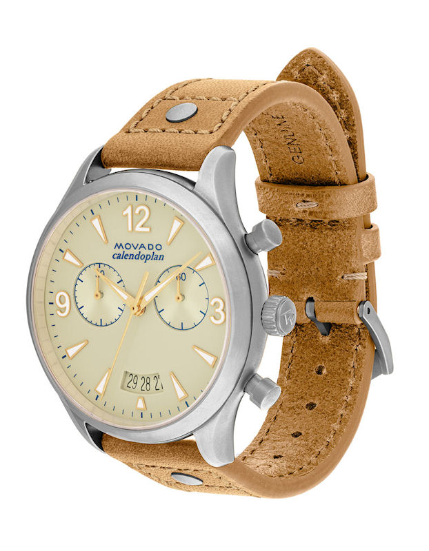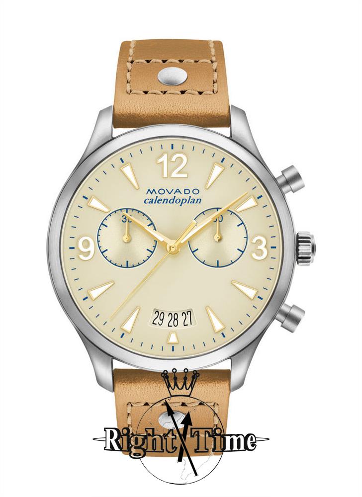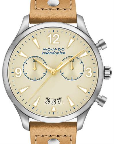 Movado Heritage Series Calendoplan watch model 3650027. Swiss quartz chronograph movement with date calendar. Stainless steel case. Ivory color dial with luminous hands and markers. Tan leather strap