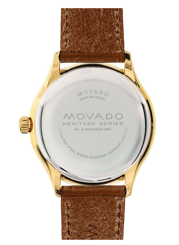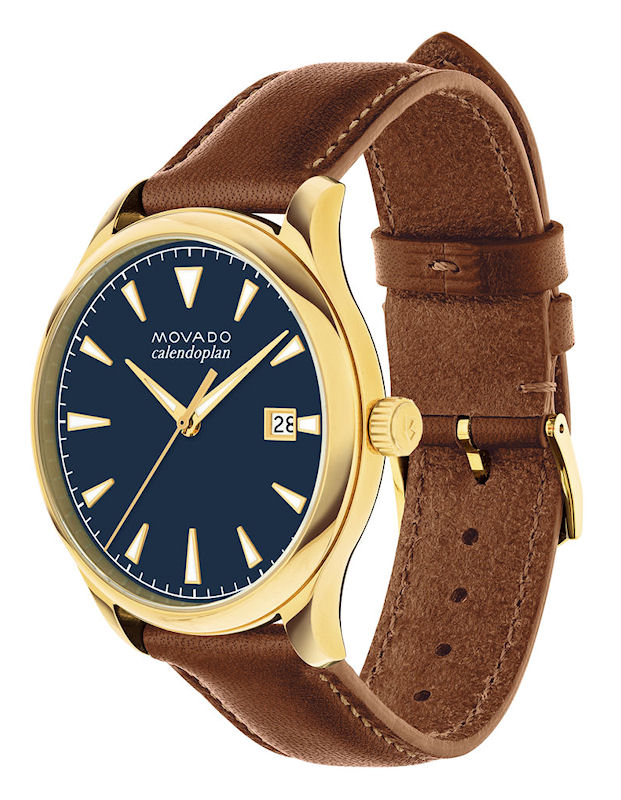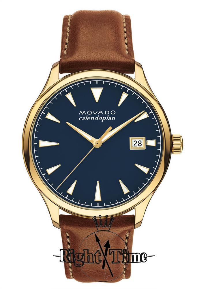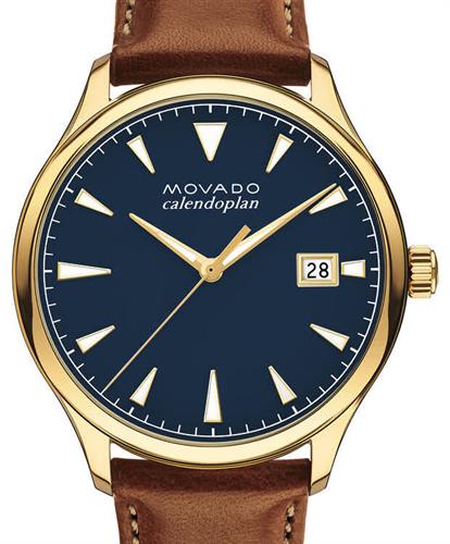 Movado Heritage Series Calendoplan watch model 3650028. Swiss quartz movement with date calendar. Stainless steel yellow gold plated case. Blue color dial with luminous hands and markers. Brown leather strap