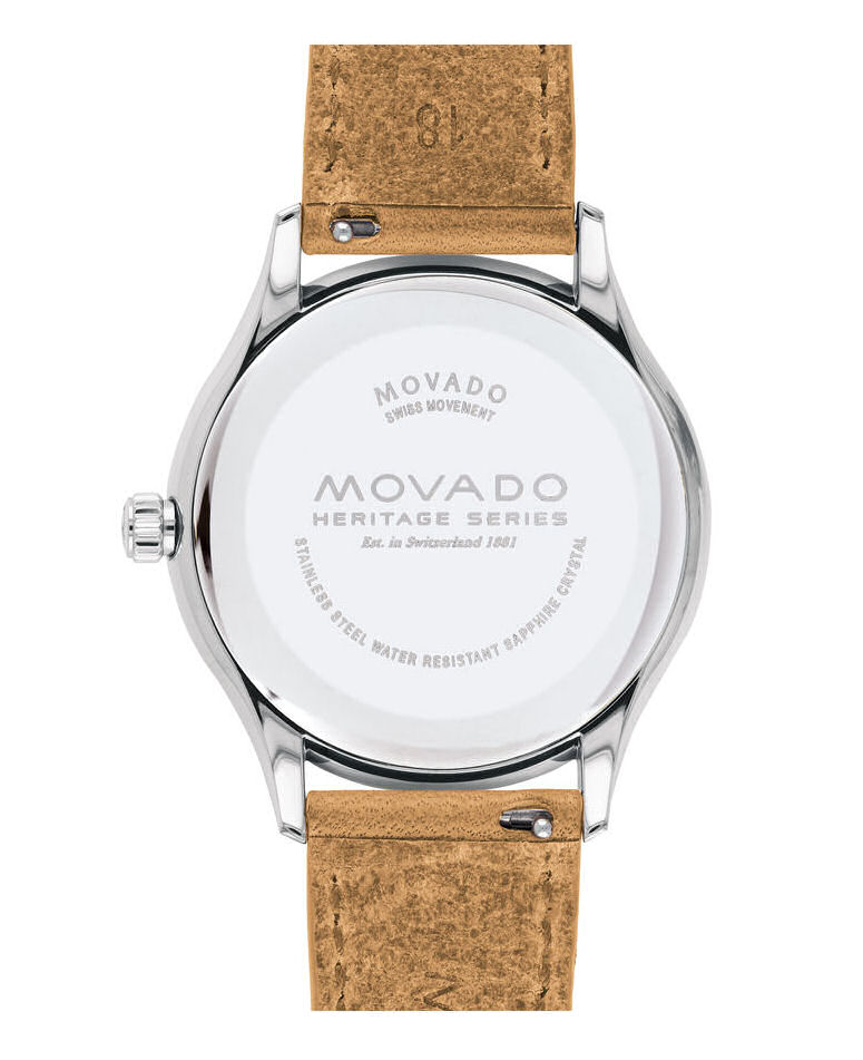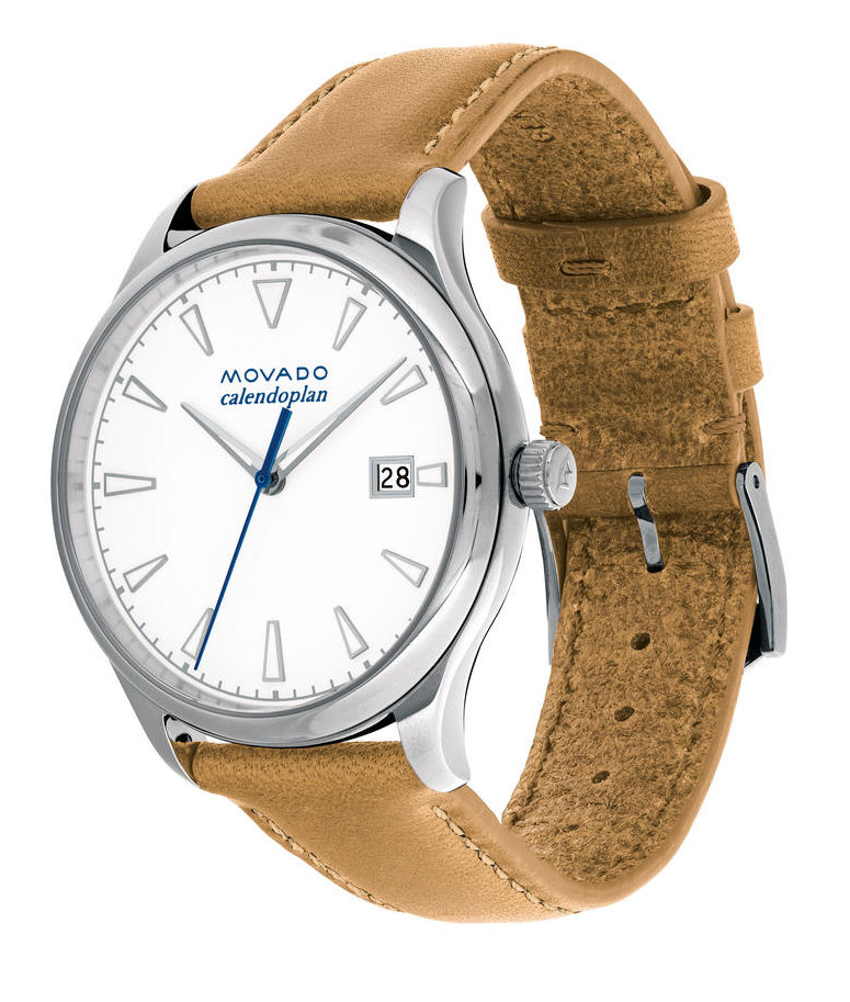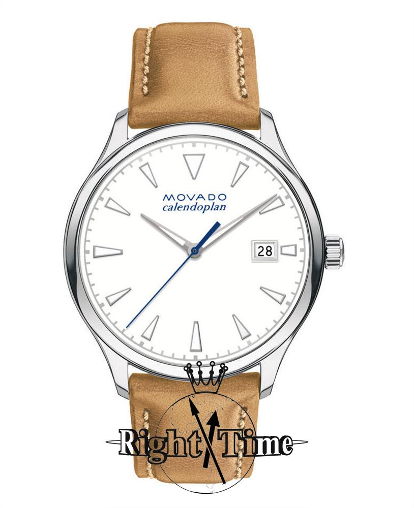 Movado Heritage Series Calendoplan watch model 3650065. Swiss quartz movement with date calendar. Stainless steel case. White color dial, luminous hands and markers. Brown leather strap