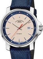 Muhle 29er Big model M1-25-36-CB. Movement is SW200 version Muhle, large 42.5mm stainless steel case, scratchproof sapphire crystal, screw down crown, see-through caseback, sand dial with applied indices, Super-LumiNova coated hands. Blue textile strap.