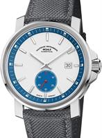 Muhle 29er Big Small Second. M1-25-87-CB-V. Movement is SW261-1 version Muhle, large 42.4mm stainless steel case, scratchproof sapphire crystal, screw down crown, see-through caseback, white dial with blue accents and applied indices, Super-LumiNova coated hands. Grey textile strap.
