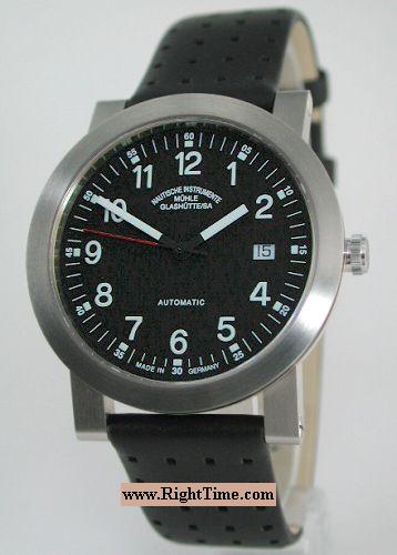 Muhle Glashutte wrist watch model M1-21-03/1 from Muhle Glashutte Design Line. Swiss Automatic movement with unique modifications. Satin finish Stainless steel case with observation case back, black leather watch band and black dial with date calendar, luminous Arabic numerals and hands