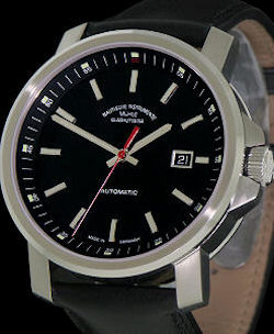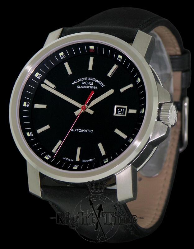Muhle 29er BIG is name of a brand new class of dinghy designed for the Kiel Week sailing event - sporty, dynamic, just like the Muhle watches. Movement is SW200 version Muhle, large 42.5mm stainless steel case, scratchproof sapphire crystal, screw down crown, see-through caseback, black dial with applied indices, Super-LumiNova coated hands. Black leather band.