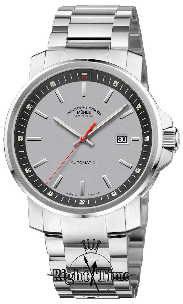 Muhle 29er Big model M1-25-37-MB. Movement is SW200 version Muhle, large 42.5mm stainless steel case, scratchproof sapphire crystal, screw down crown, see-through caseback, grey dial with applied indices, Super-LumiNova coated hands. Comes on bracelet.