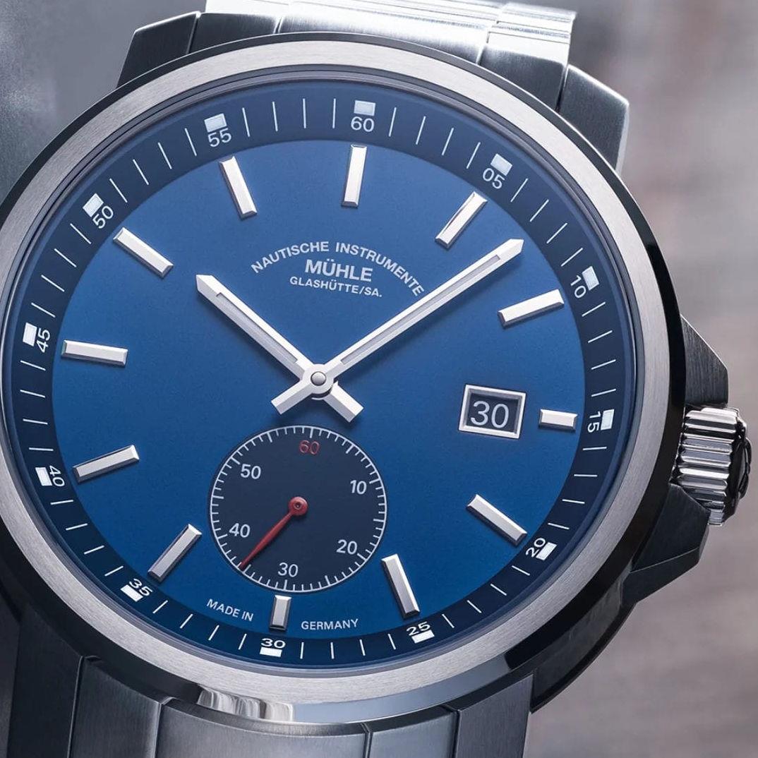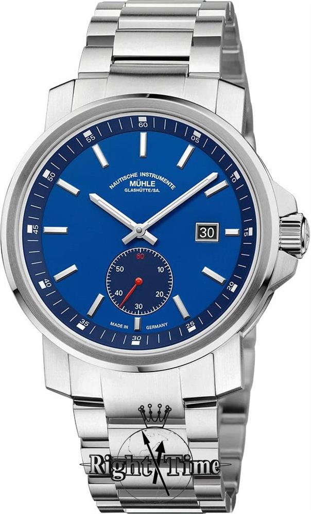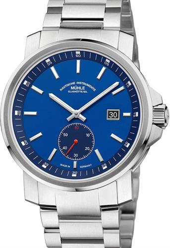 Muhle 29er Big Small Second. M1-25-82-MB. Movement is SW261-1 version Muhle, large 42.4mm stainless steel case, scratchproof sapphire crystal, screw down crown, see-through caseback, blue dial with applied indices, Super-LumiNova coated hands. Bracelet.