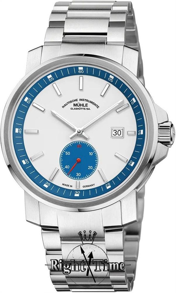 Muhle 29er Big Small Second. Model M1-25-87-MB. Movement is SW261-1 version Muhle, large 42.4mm stainless steel case, scratchproof sapphire crystal, screw down crown, see-through caseback, white dial with blue color accents and applied indices, Super-LumiNova coated hands. Bracelet.
